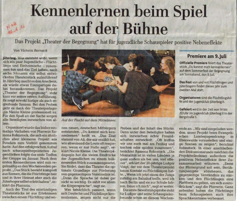 Zeitungsartikel Theater der Begegnung in Jüterbog (2) 29. Juli 2016 874 × 743 Du kannst mich kennenlernen – Theater der Begegnung in Jüterbog