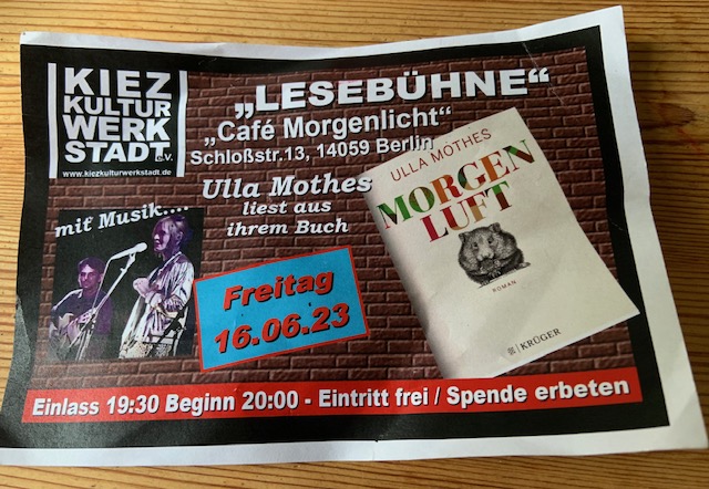 Allgemeines „Morgenluft“ musikalische Lesung 18. Juni 2023 theatermassnahmen mit der Autorin Ulla Mothes! Kjell und Nicole („Lovely friday“) haben musikalisch begleitet. Hat trotz Gewitter – deshalb drinnen… – Spaß gemacht und wir wiederholen es diesen Sommer nochmal auf Wunsch in Kyritz.